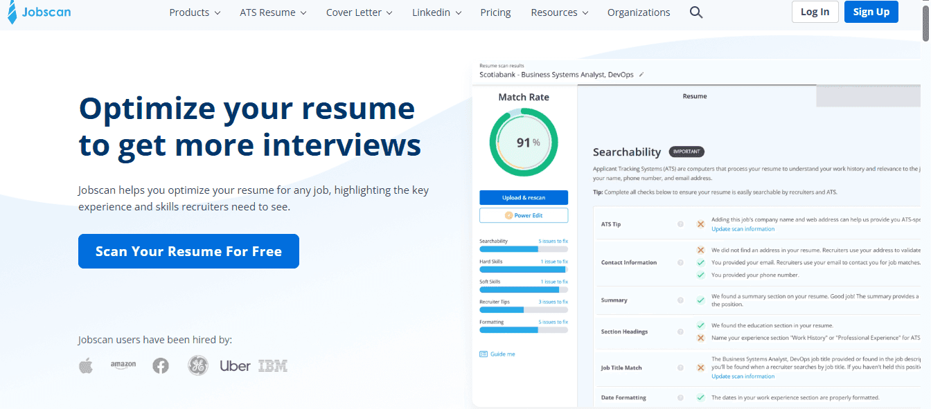 Jobscan focuses heavily on ATS optimization and resume matching alongside their tracking features. With their job application tracker, you can organize and manage everything related to your job search in one place, while making sure your applications pass automated screening systems.